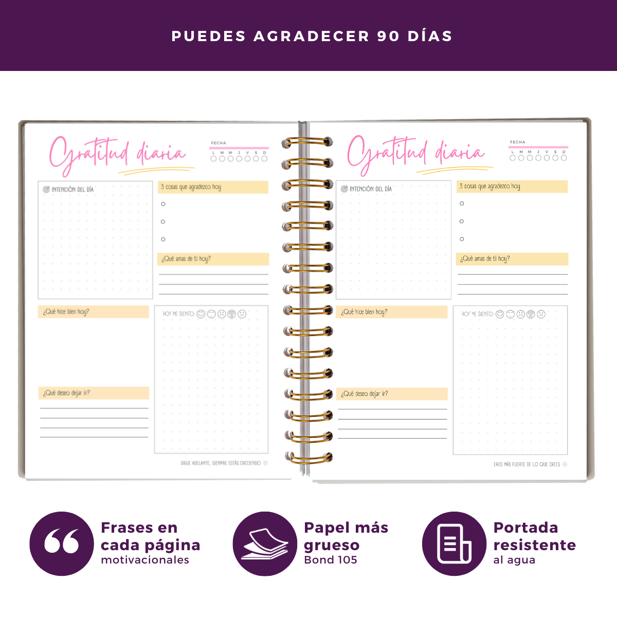 - 90 días de gratitud y reflexión. Espacios diarios estructurados para agradecer, analizar emociones y dejar ir lo negativo.