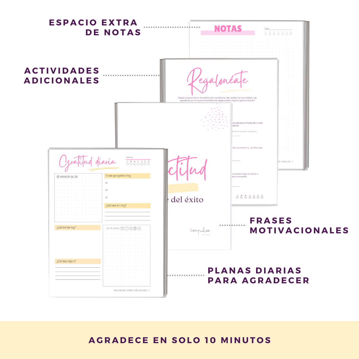 - Espacio extra para escribir. Incluye hojas de notas para reflexiones, ideas y ejercicios personalizados.