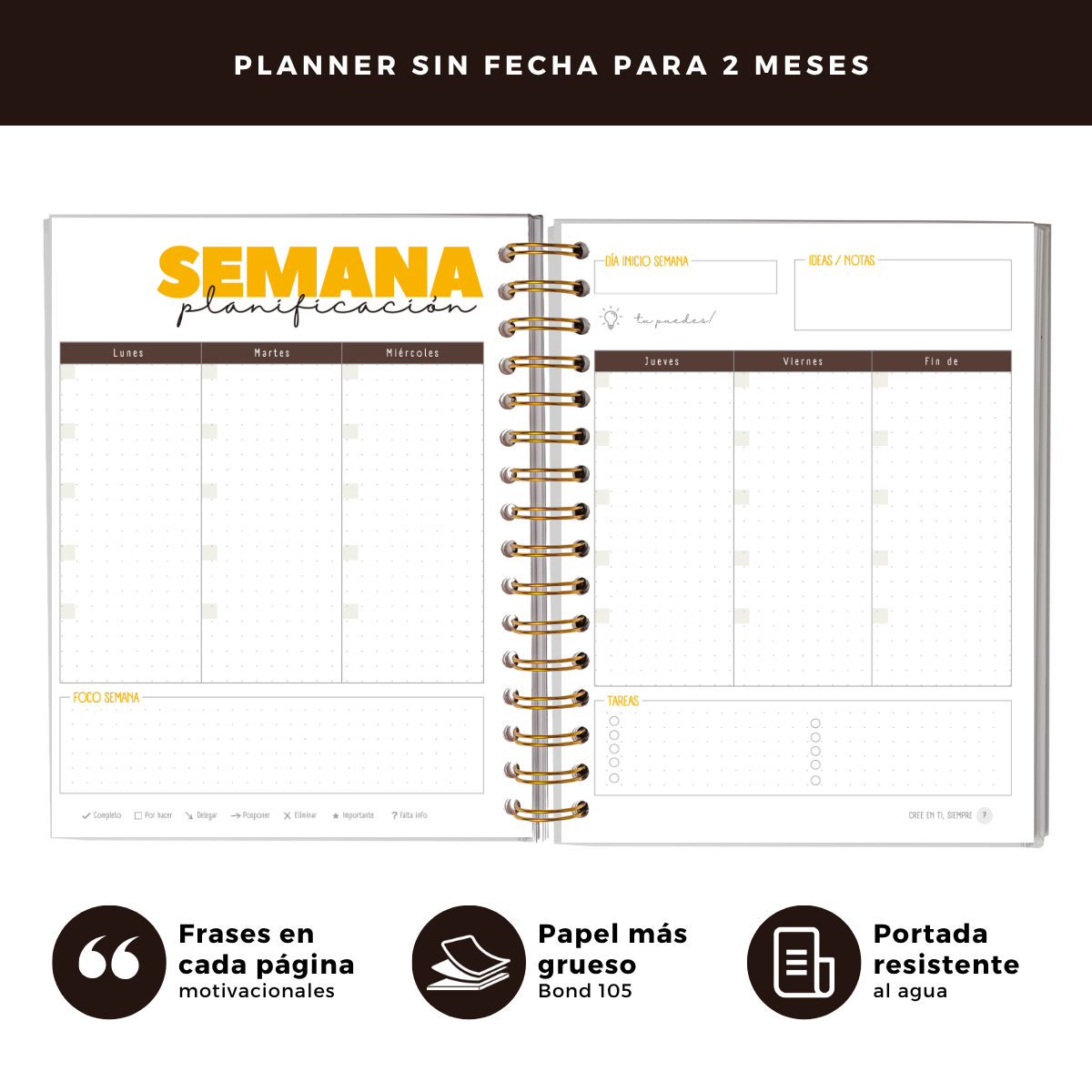- Planificación semanal (9 semanas): Incluye foco semanal, seguimiento de hábitos y espacio para ideas o reflexiones.